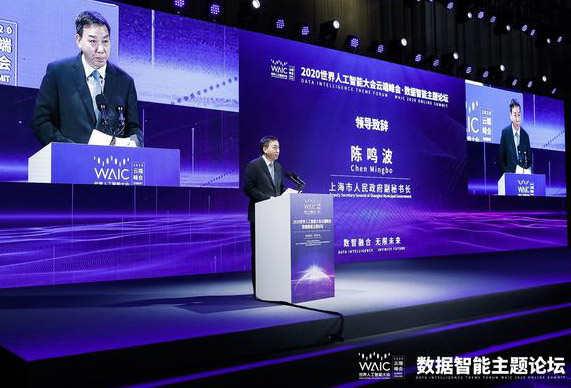 2020世界人工智能大会云端峰会数据智能主题论坛在上海召开,上海市人民政府副秘书长陈鸣波为数据智能主题论坛致辞。中科公司分管国际产业的陈总出席论坛,并与试点建设单位达成合作意向,签订了战略合作协议。