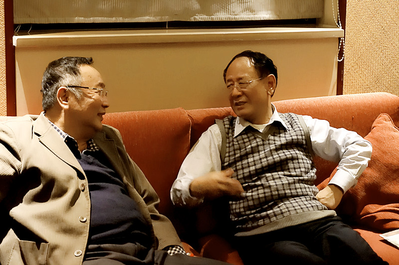 中科公司董事冯精志先生(左)和曹雪芹研究会会长胡德平先生(右)在交流、探讨