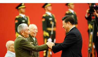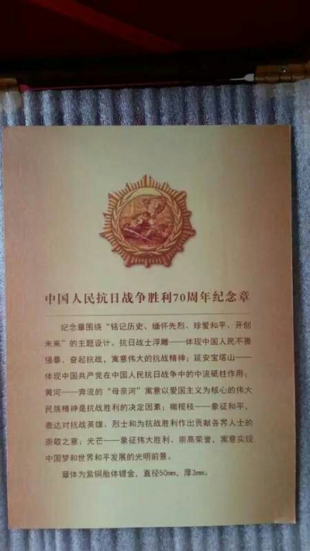 习近平总书记在人民大会堂向30名抗战老战士、老同志、抗战将领、为中国抗战胜利做出贡献的国际友人或遗属代表颁发“中国人民抗日战争胜利70周年”纪念章。抗战老前辈、公司高级顾问于老名列其中,95岁,现居住于北京军区干休所。