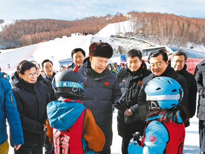 一些正在练习的滑雪爱好者看到总书记来了,激动地围了过来。习近平同他们亲切交流,询问他们的滑雪体验。在一群正在这里参加滑雪冬令营的少年儿童中间,习近平俯下身子,问他们多大了、从哪里来、练滑雪难不难,鼓励他们好好学习、健康成长,在滑雪练习中既勇于挑战,又注意安全。