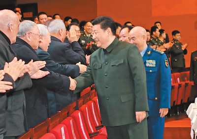 下午4时许,习近平来到老同志中间,全场响起热烈掌声。习近平同大家亲切握手,关切询问他们的身体和生活情况,共同回顾党的十八大以来党、国家、军队事业取得的历史性成就、发生的历史性变革。老同志们很振奋,一致表示要更加紧密地团结在以习近平同志为核心的党中央周围,全面深入贯彻党的十九大精神,以习近平新时代中国特色社会主义思想为指导,贯彻习近平强军思想,牢固树立“四个意识”,自觉坚定“三个维护”,满怀信心迎接强国强军新时代。