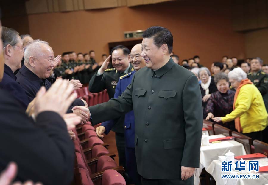 下午3时30分许,习近平来到老同志中间,全场响起热烈掌声。习近平同大家亲切握手,关切询问他们的身体和生活情况,共同回顾在党的十九大精神指引下,过去一年来党、国家和军队事业展现的新气象、开创的新局面、取得的新成就。老同志们一致表示要更加紧密地团结在以习近平同志为核心的党中央周围,坚持以习近平新时代中国特色社会主义思想为指导,深入贯彻习近平强军思想,深入贯彻新时代军事战略方针,锐意进取,埋头苦干,以优异成绩迎接新中国成立70周年。