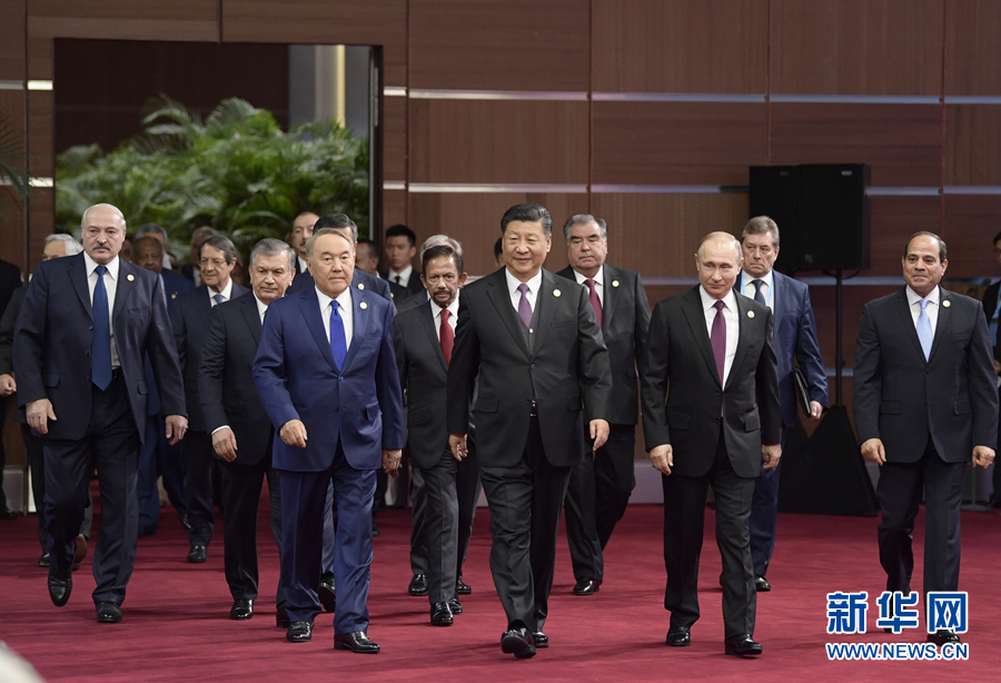 4月26日,国家主席习近平在北京出席第二届“一带一路”国际合作高峰论坛开幕式,并发表题为《齐心开创共建“一带一路”美好未来》的主旨演讲。这是习近平和出席开幕式的外方领导人共同步入会场。 新华社记者李学仁摄