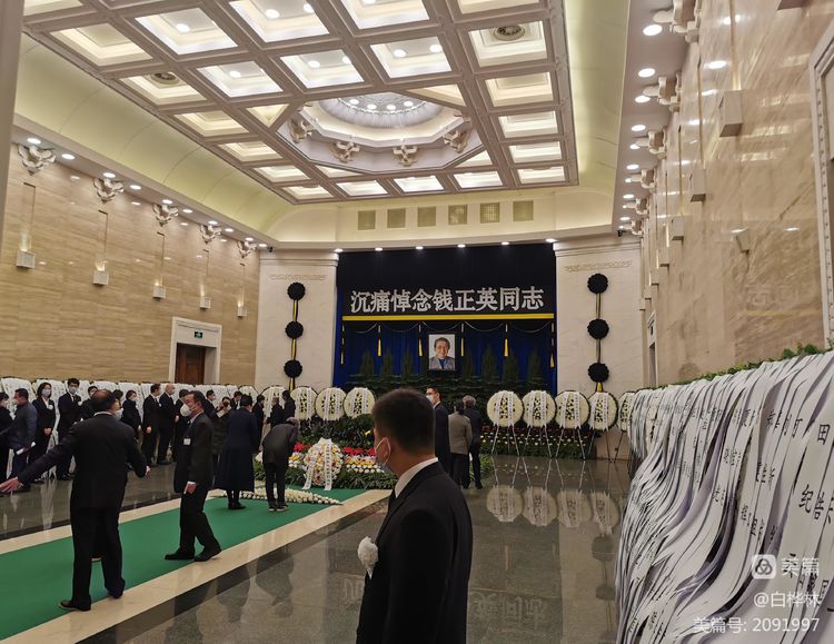 八宝山革命公墓礼堂庄严肃穆,哀乐低回。正厅上方悬挂着黑底白字的横幅“沉痛悼念钱正英同志”,横幅下方是钱正英同志的遗像。钱正英同志的遗体安卧在鲜花翠柏丛中,身上覆盖着鲜红的中国共产党党旗。